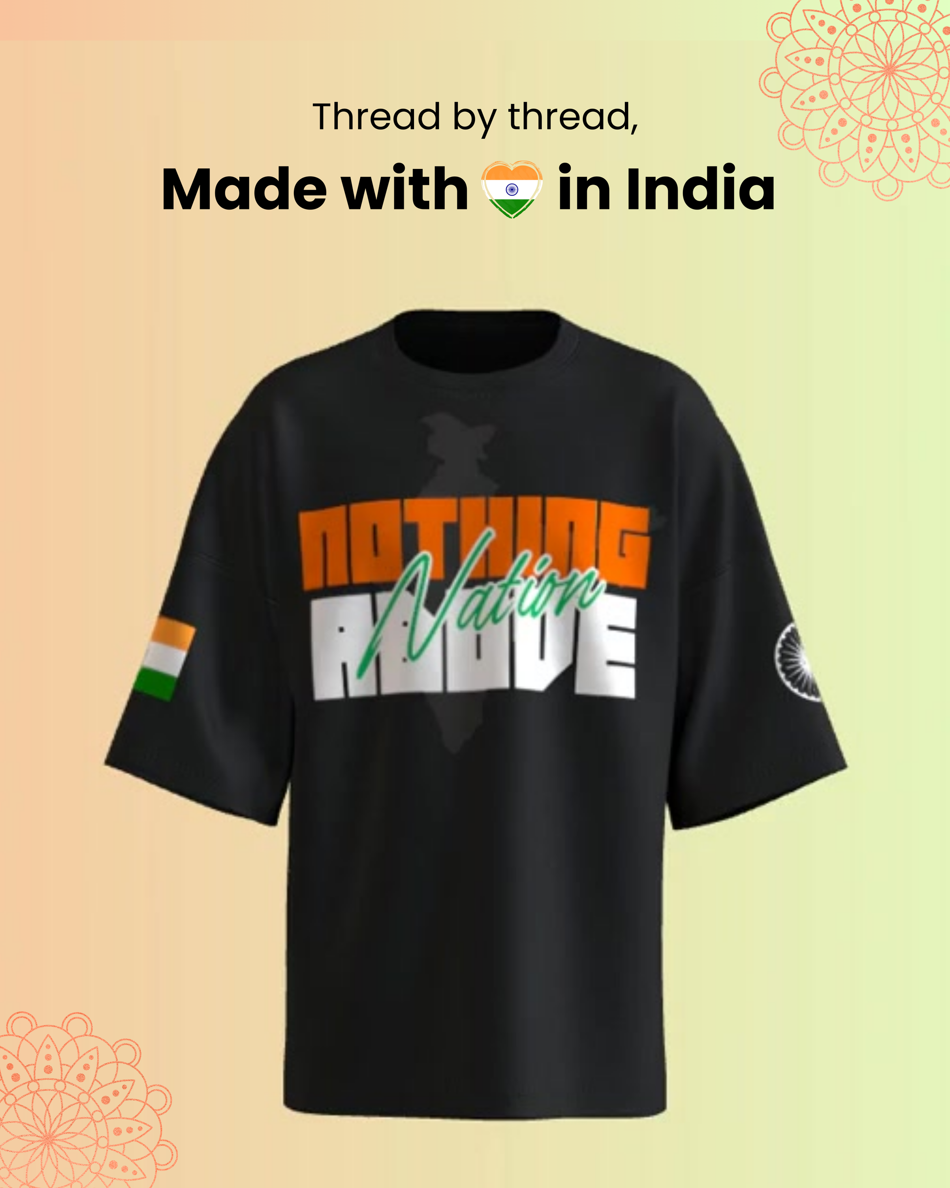 Celebrate your patriotism in style with the Zrech “Nothing Above Nation” T-shirt. Crafted from premium, breathable cotton, this bold black tee features a striking tri-color typography design with the message Nothing Above Nation set against the silhouette of India. The Indian flag proudly decorates the left sleeve, while the Ashoka Chakra emblem accents the right, making it a perfect blend of style and national pride. Whether for Independence Day, Republic Day, or daily wear, this T-shirt speaks volumes without saying a word.
